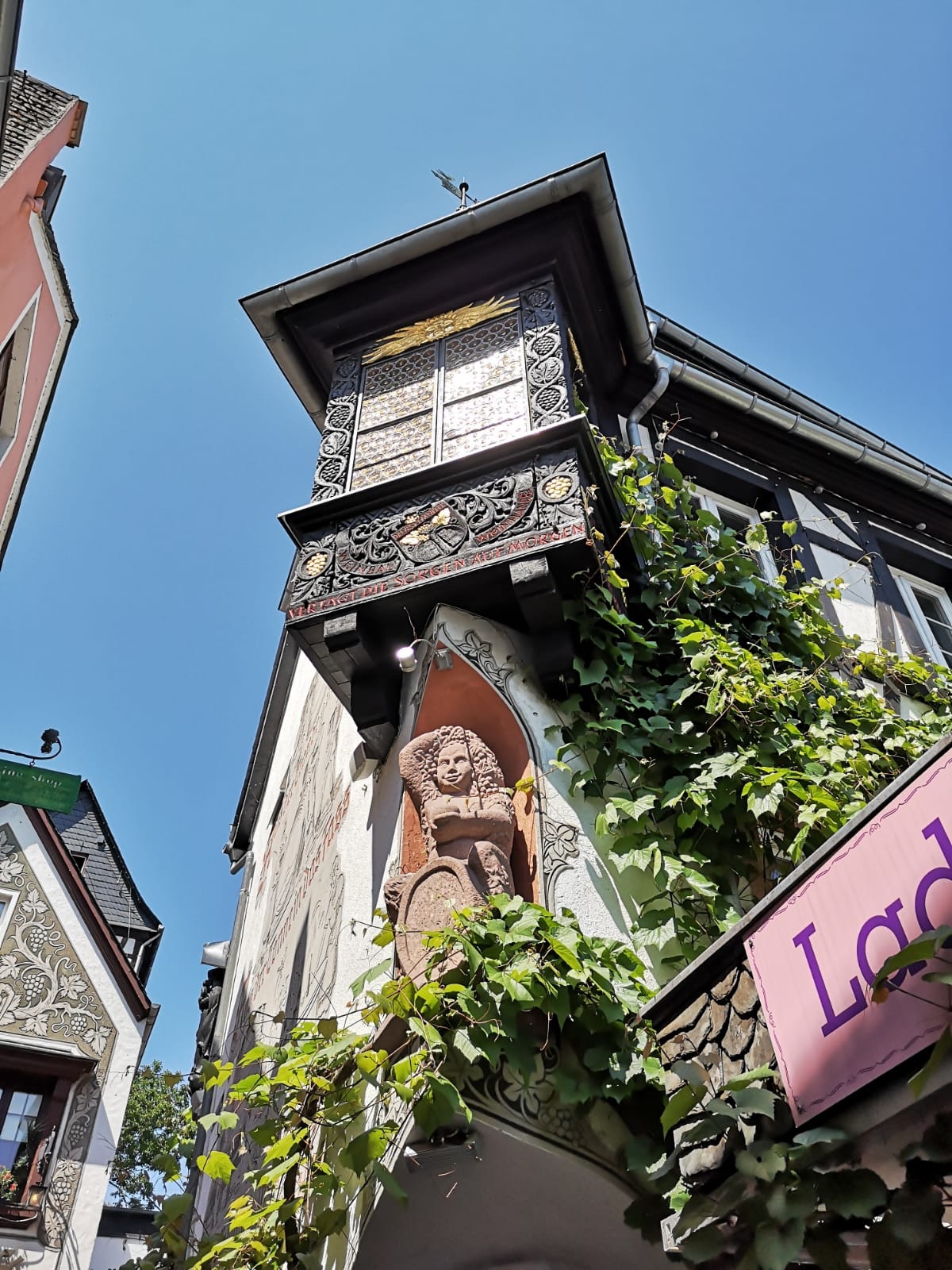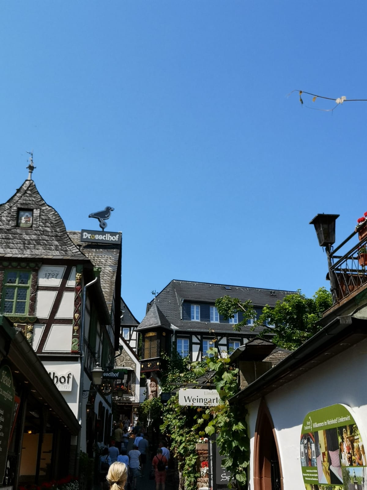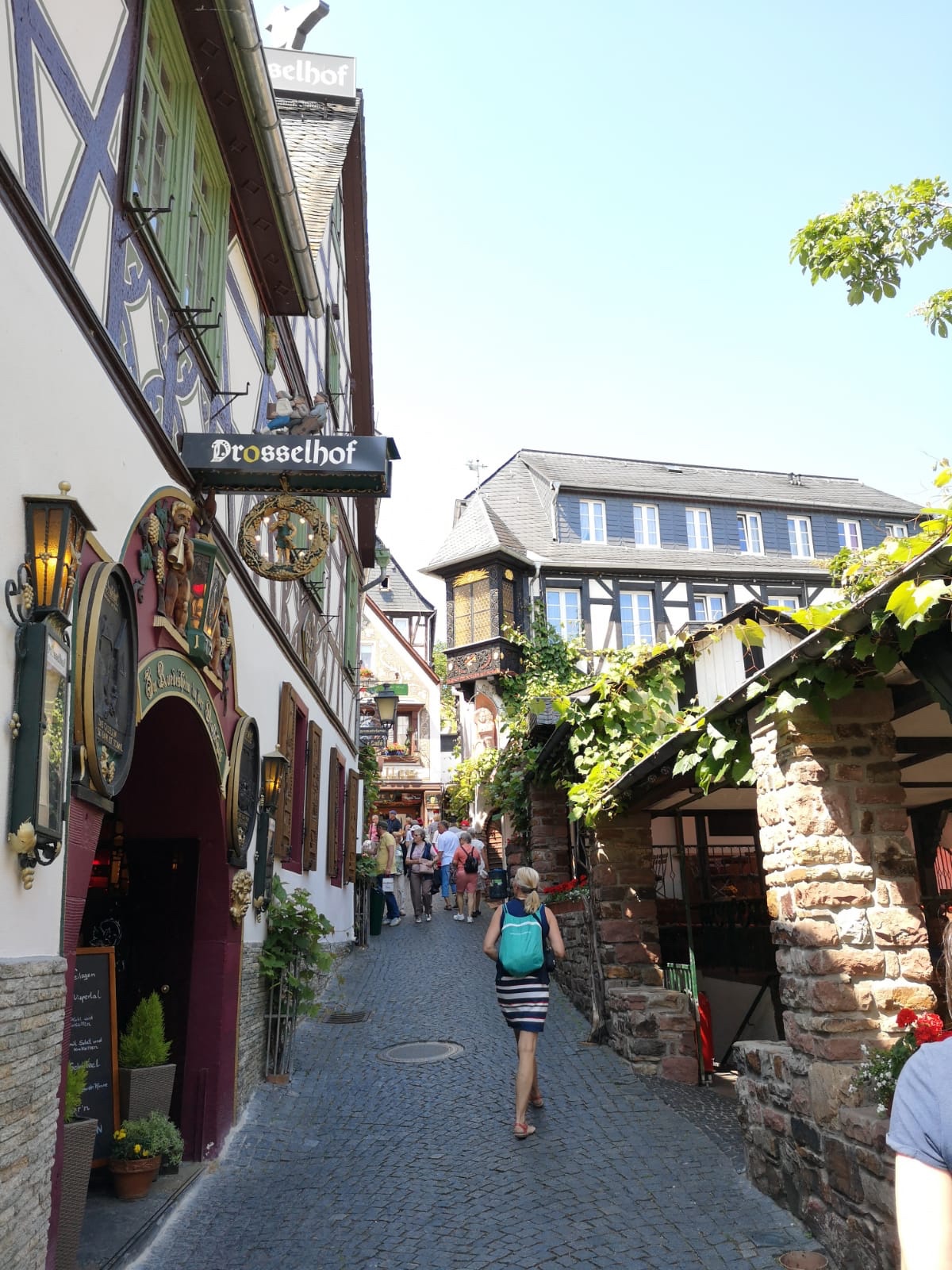Ausflüge gingen durch Wiesbaden, welches eine wirklich schöne Stadt ist, nur allein vom durchfahren, aber wir hatten ein anderes Ziel: Rüdesheim am Rhein. Ein wirklich schöner Flecken Erde. Kein Wunder, das der Wein hier was wird. Ein Spaziergang trotz Bullenhitze, gerade für die aus dem kühlen Irland kommenden Personen durch die Drosselgasse war aber Pflicht. Viele Touristen schoben sich durch die schmalen Gassen, aber trotzdem war es ein Ausflug wert. Es blieb nicht aus, dass man zwangsweise an die Winkelgasse erinnert wurde, aber man suchte vergebens den Shop von Ollivanders Zauberstäben.