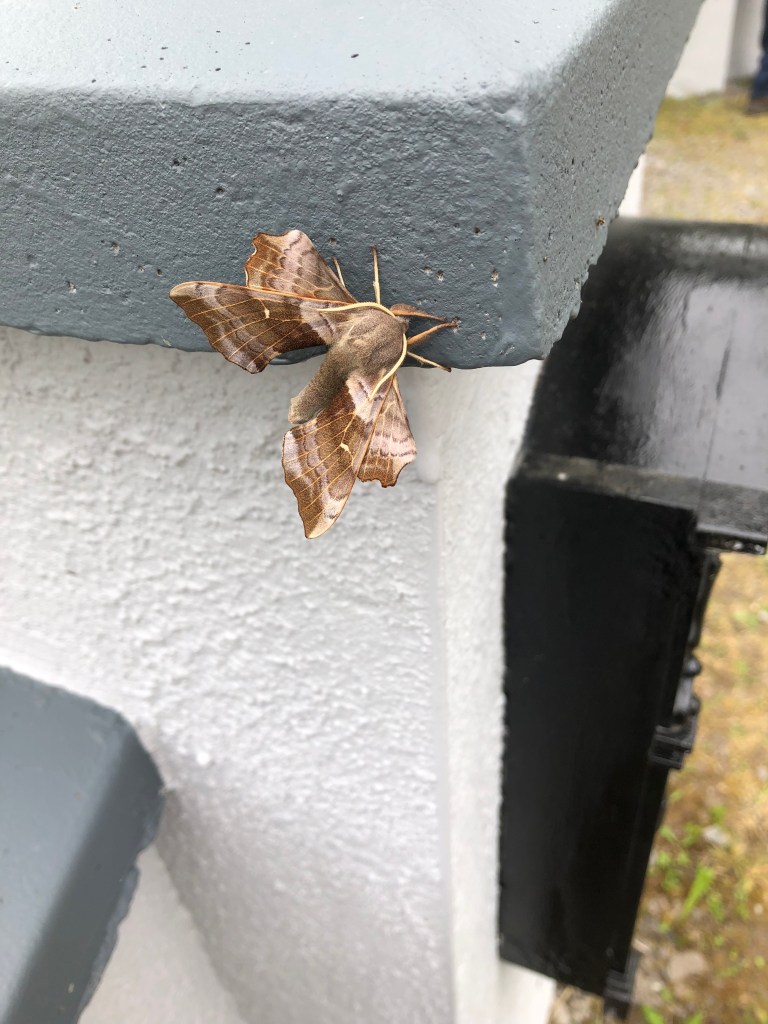 Und der nicht so schöne, aber interessante Schmetterling Pappel-Schwärmer saß auch über Stunden an der Eingangsmauer.