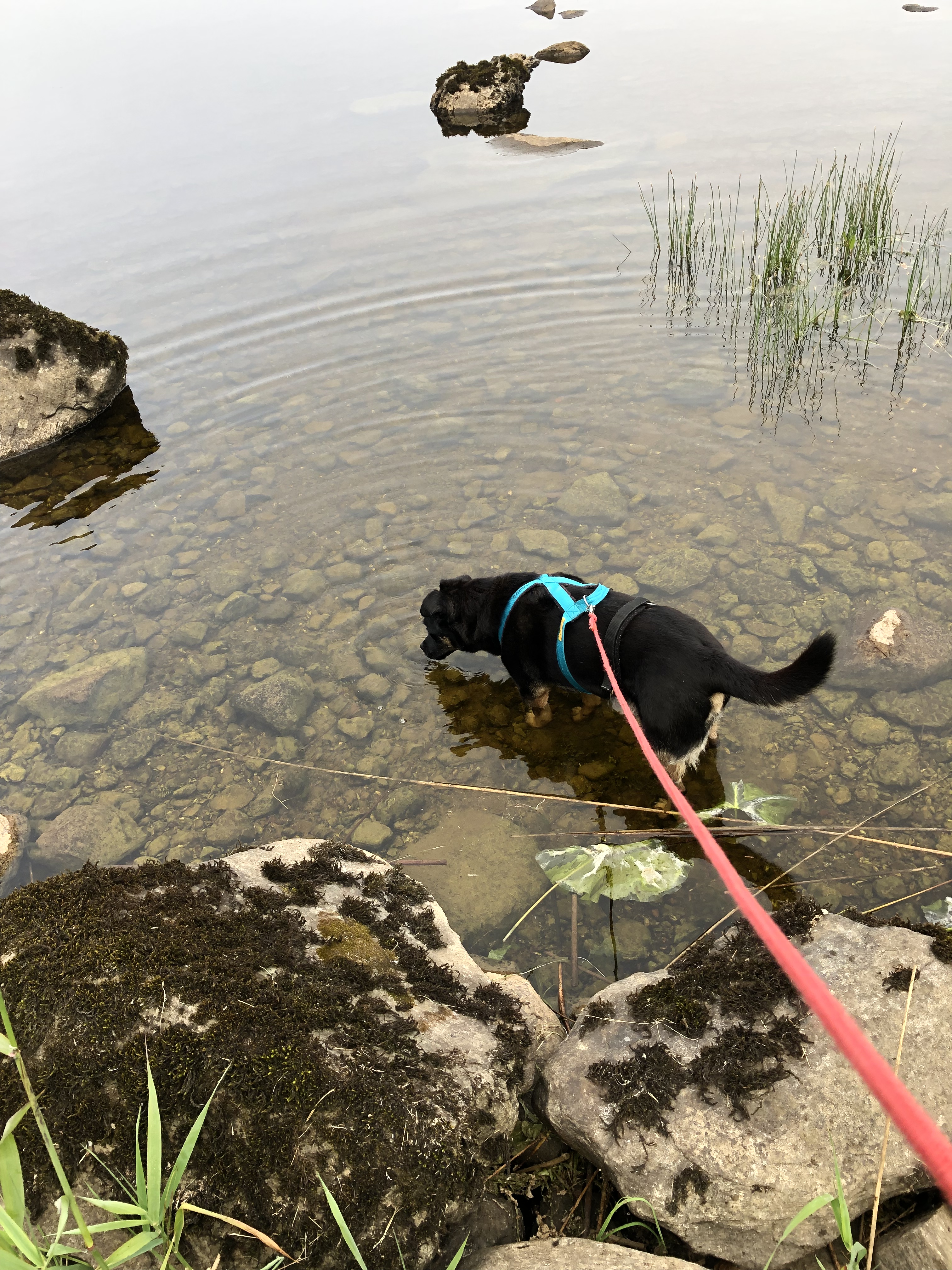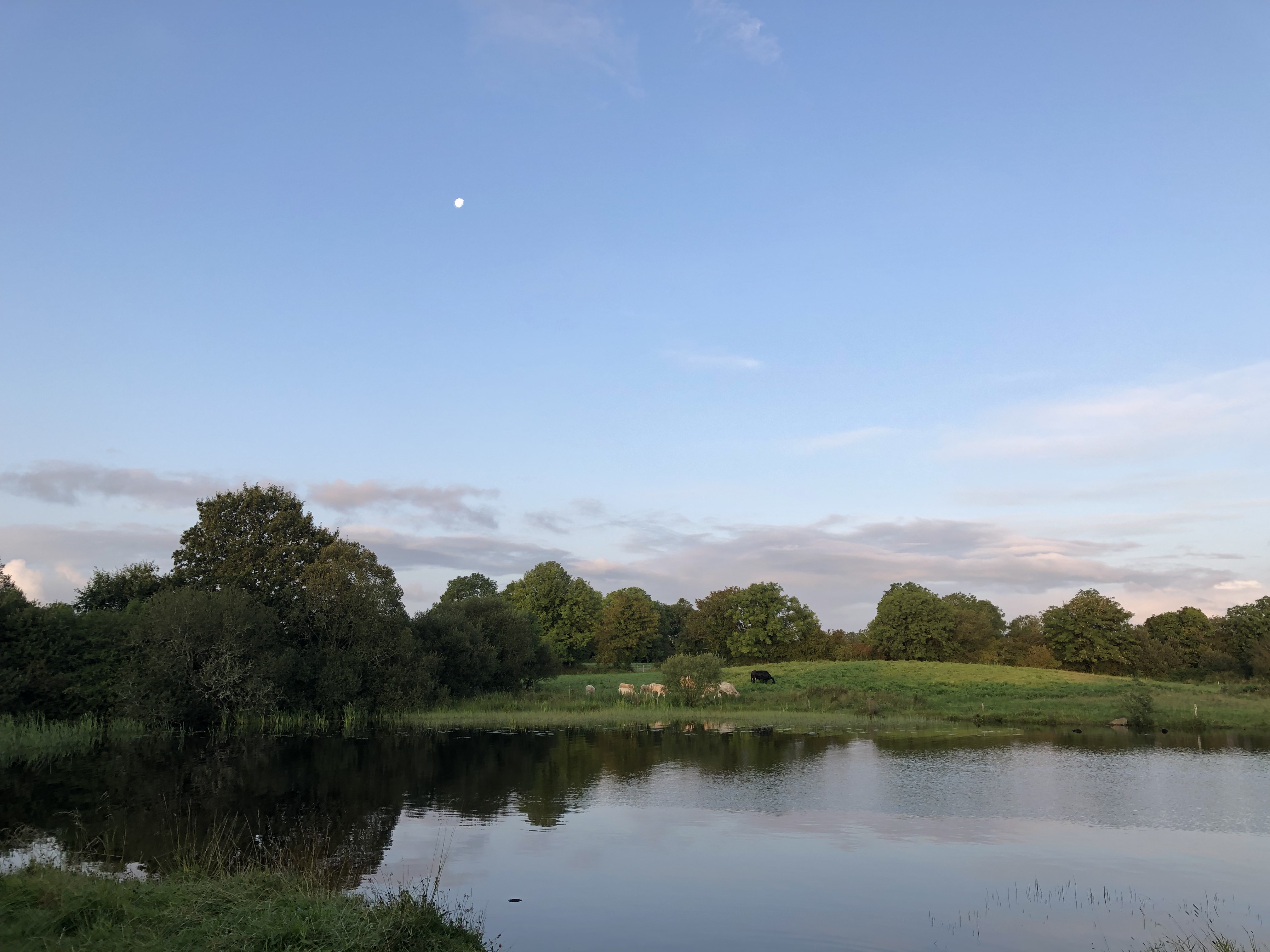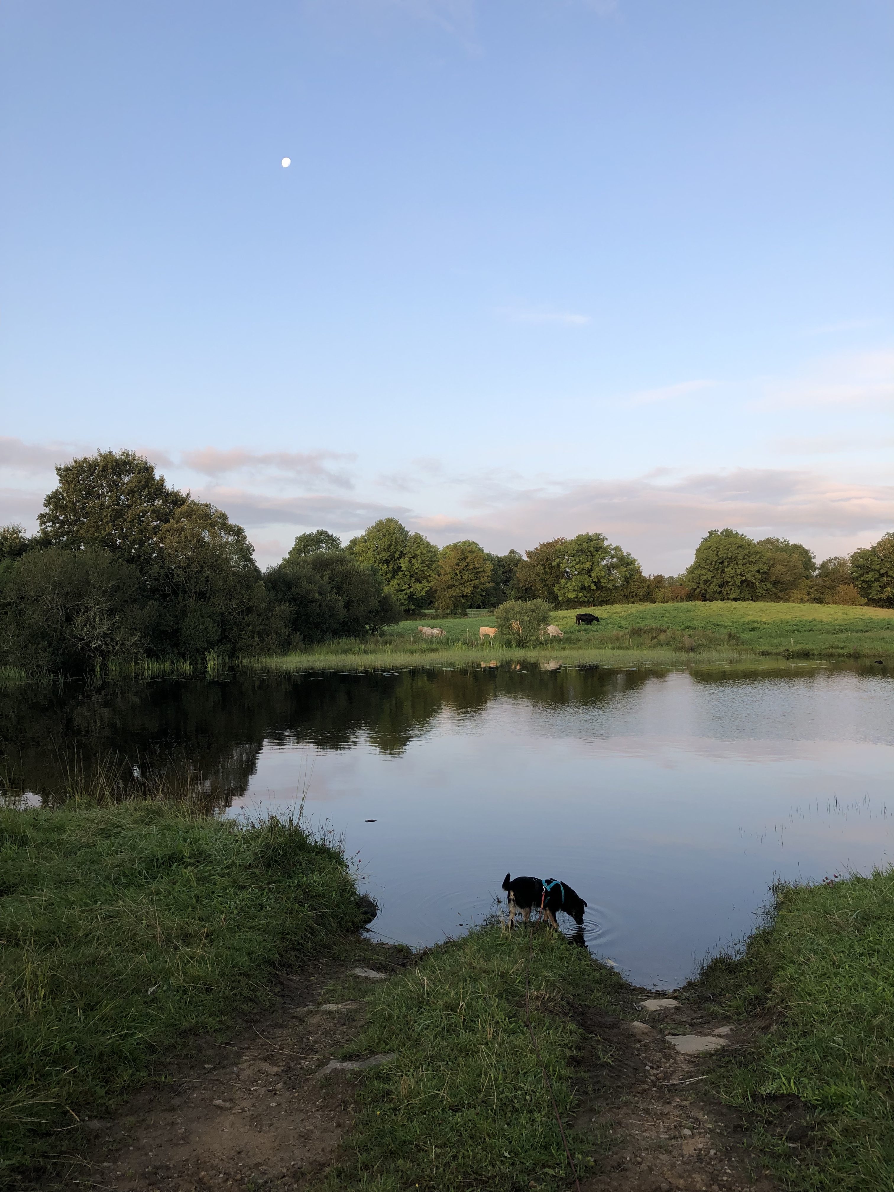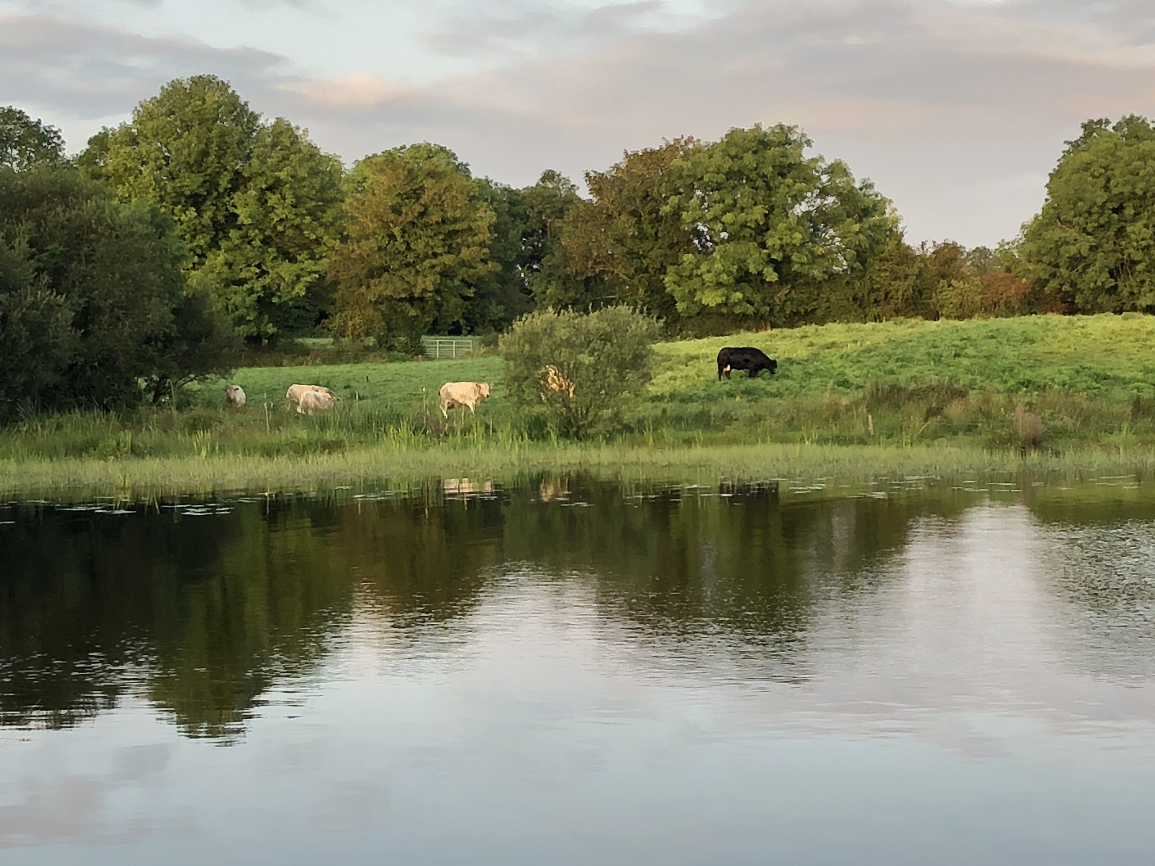 Morgendliche Idylle mit Rinderherde auf der anderen Uferseite und ein Rocky im klaren Wasser des Lough Boderg.