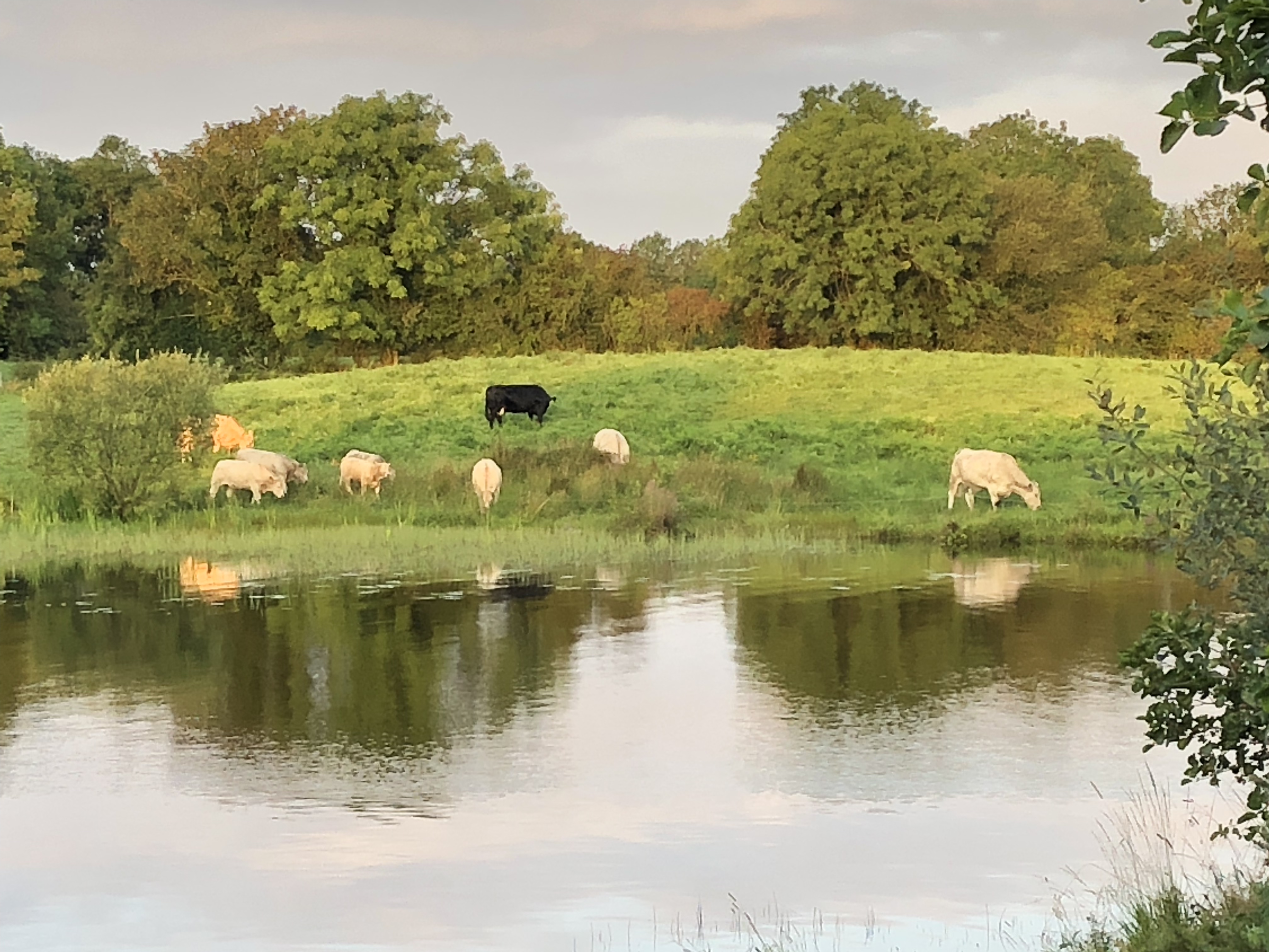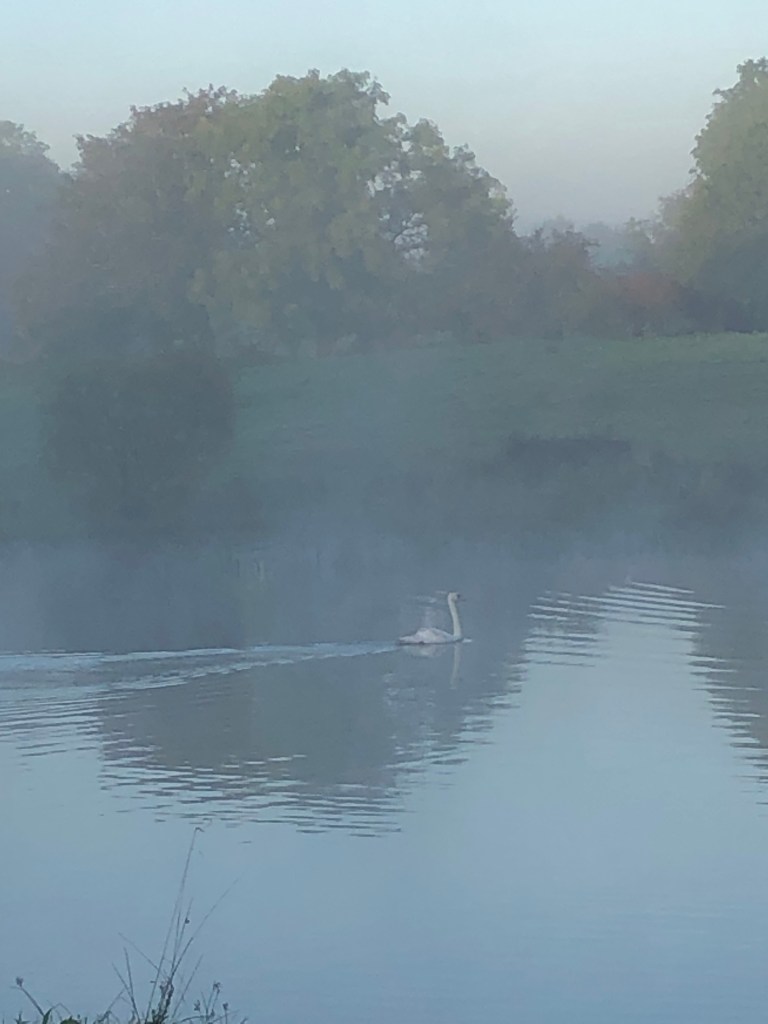 Frühnebel bei der morgendlichen Gassi Runde. Rinder und Schwäne sind im Nebel nur schwer auszumachen.